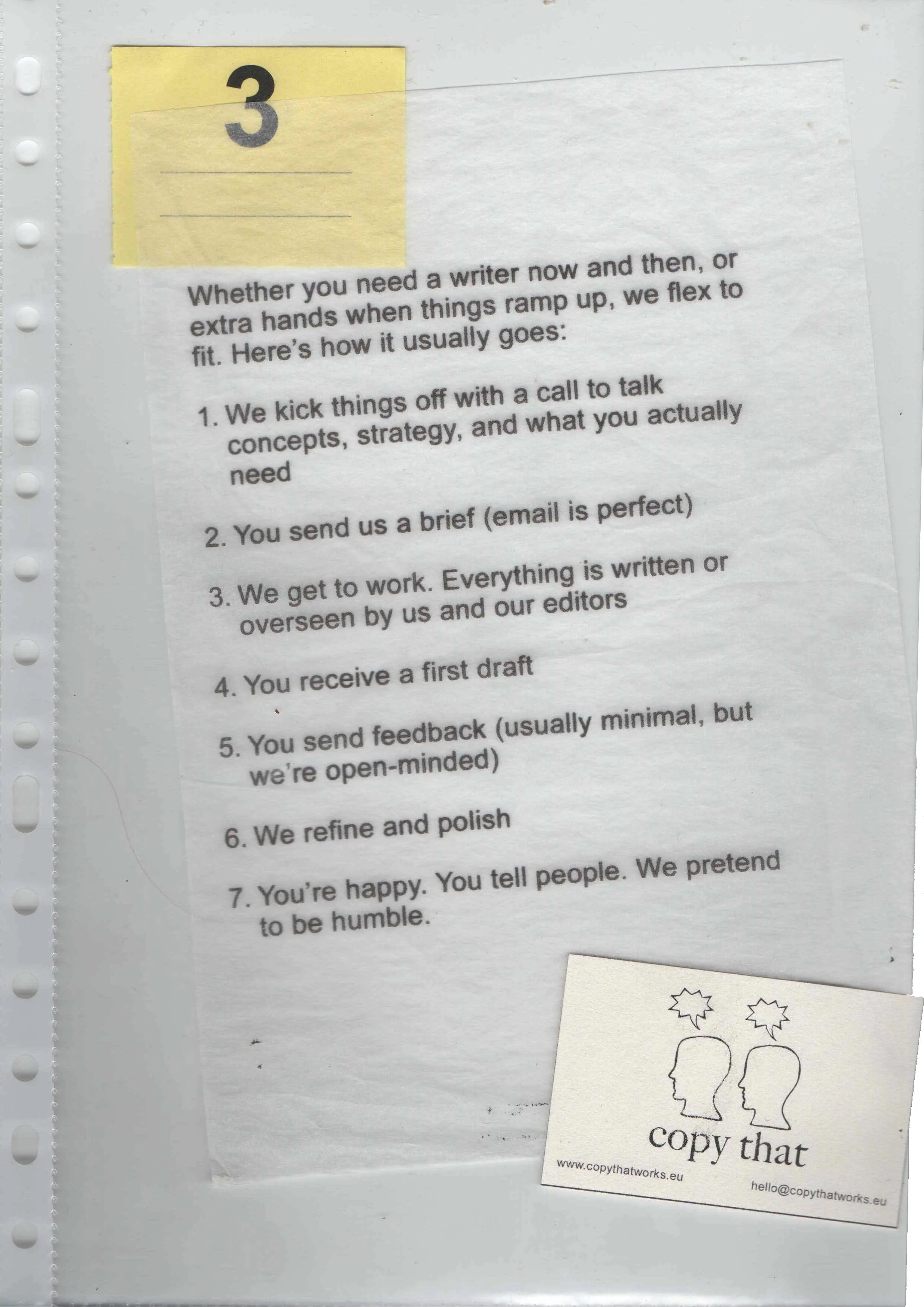 Hello. We’re copy that, a creative* copywriting studio that does all the usual stuff and then some.